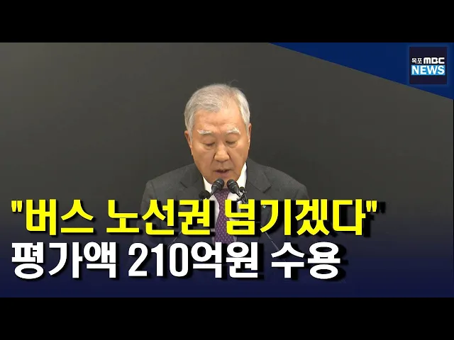 ◀ 앵 커 ▶목포형대중교통시스템 구축을 위한시민공론화위원회가 시내버스 노선권에 대해 210억 원의 평균 감정가액을 제시했었는데요, 이한철 대표가 노선권 감정평가액을 수용하고 부채를 정리한 뒤 일선에서 물러나겠다는 뜻을 밝혔습니다. 박종호 기자가 취재했습니다. ◀ 리포트 ▶누적된 적자를 버티지 못해회사 경영에...