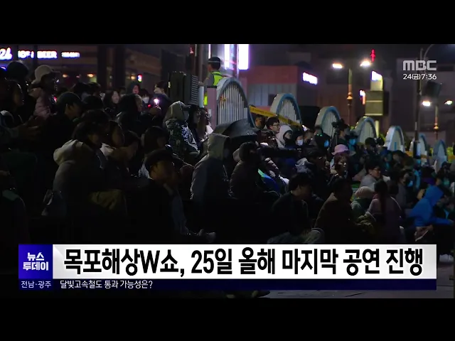 목포시가 이번주 토요일 평화광장 해상무대에서 올해 목포해상W쇼 마지막 공연을 선보입니다.이번 공연은 '지금은 목포시대'라는 주제로 가수 싸이버거의 공연과 불꽃쇼 융합 콘서트가 꾸며지며 사전 공연으로 퓨전국악 그룹 '밴드 이강'의 공연도 펼쳐집니다. 목포시는 내년 목포해상W쇼는 기능 개선을 마무리한 '춤추는 ...