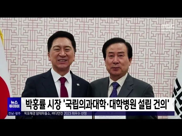 박홍률 목포시장은 국민의힘 김기현 당대표와 민주당 김영진 당대표 정무실장을 만나국립의과대학과 대학병원 설립을 건의했습니다. 박 시장은목포대의 경우 2019년 교육부 의대설립 타당성 조사용역 결과 의대설립 타당성과 경제성이 입증된데다 대학병원 설립부지도 확보돼 있다며 의대신설과 대학병원 설립을건의했습니...