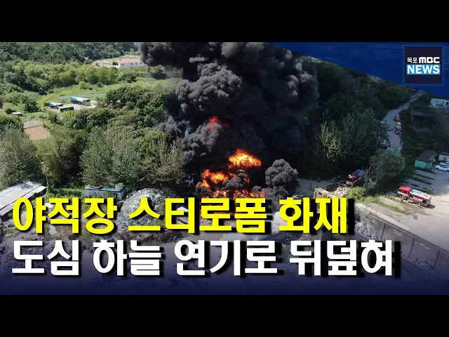 ◀ANC▶ 오늘(7) 목포 도심 하늘이 갑자기 검은 연기로 뒤덮혀 깜짝 놀라셨던 분들 많으실 겁니다. 목포의 한 재활용센터 야적장에서 발생한 화재 때문이었는데요. 다행히 인명피해는 없었지만 스티로폼이 타면서 발생한 검은 연기가 쉴새없이 뿜어져 나와 119에 신고가 빗발쳤습니다. 안준호 기자가 취재했습니다. ◀EN...