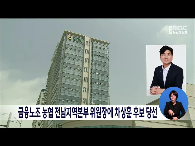 제13대 금융노조 NH농협지부 전남지역본부 위원장에 차상훈 후보가 당선됐습니다. 목포 출신으로 농협 목포중앙지점과 전남여신관리단 등에서 근무한 차상훈 신임 위원장은 조합원들의 위치에서 경청하고 공감하겠다고 밝혔습니다. 당선자 임기는 10월 11일부터 3년 입니다.