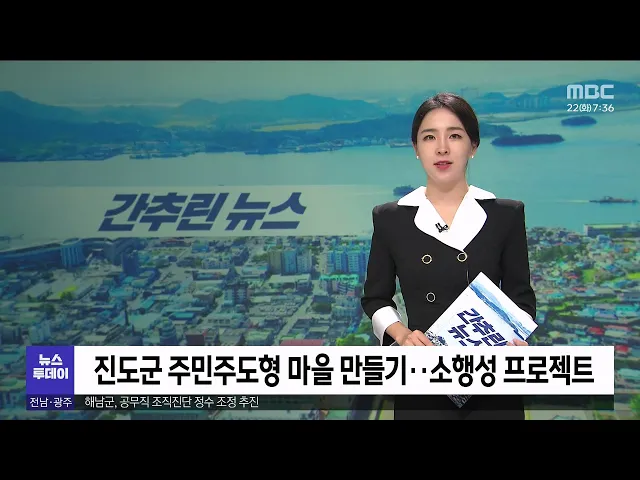 ◀ANC▶ 오늘의 간추린 뉴스입니다. 진도군이 주민주도형 마을 만들기인 소행성 프로젝트를 추진합니다. 진도군은 지역소멸을 극복하고, 살기좋은 공동체를 만들기 위해 242개 마을에서 마을 이야기 벽화와 꽃밭조성, 안심조명 설치 등의 사업을 진행합니다 ------------ 해남군은 공무직의 업무통합과 직종 재분류 등의 ...