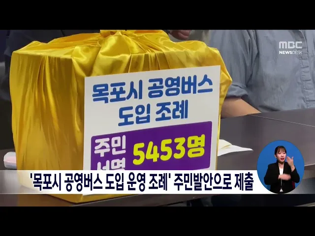 목포시내버스 공공성 강화 범시민 대책위원회는 오늘(4) 목포시 공영버스 도입 운영조례를 주민발안으로 시의회에 제출했습니다. 이번 주민조례 발안에는 목포시 18세 이상 5천 4백여 명의 서명을 받아 제출됐으며 앞으로 50일 동안 명부확인과 열람, 이의신청을 받아 발의여부가 결정됩니다.