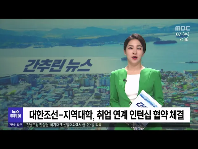 ◀ANC▶ 오늘의 간추린 뉴스입니다. 대한조선과 지역 대학 3곳이 취업연계 인턴쉽 운영에 대한 협약을 체결했습니다. 대한조선과 목포대, 목포해양대, 조선대 등은 전문 기술인력 양성과 현장실습을 통한 취업연계 프로그램 운영 등에 협력하기로 했습니다. --------- 무안군은 농기계 임대소를 6월 한달동안 토요일에도 ...