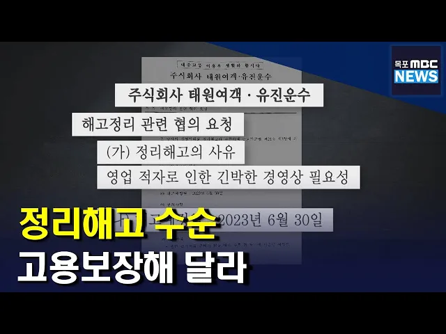 ◀ANC▶ 태원유진운수 이한철 회장이 다음 달까지 경영일선에서 손을 떼기로 한 가운데 회사정리 절차에 들어가고 있습니다. 버스회사측은 노동조합에 정리해고 협의를 요청했고 노동조합은 고용보장 등을 요구하고 나섰습니다. 김 윤 기자가 취재했습니다. ◀END▶ (C/G) 태원유진운수가 노동조합에 보낸 해고정리 협의 ...