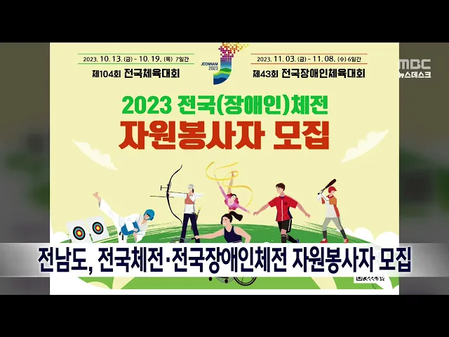 전라남도는 전국체전과 전국장애인체전에서 활동할 자원봉사자 3천 명을 다음 달 23일까지 모집합니다. 모집 대상은 만 18세 이상의 광주·전남 거주자로, 경기 운영 지원과 장애 보조 등 8개 분야를 맡게 됩니다. 올해 전국체전과 전남 장애인체전은 오는 10월 목포 등 전남 22개 시군에서 열릴 예정입니다.