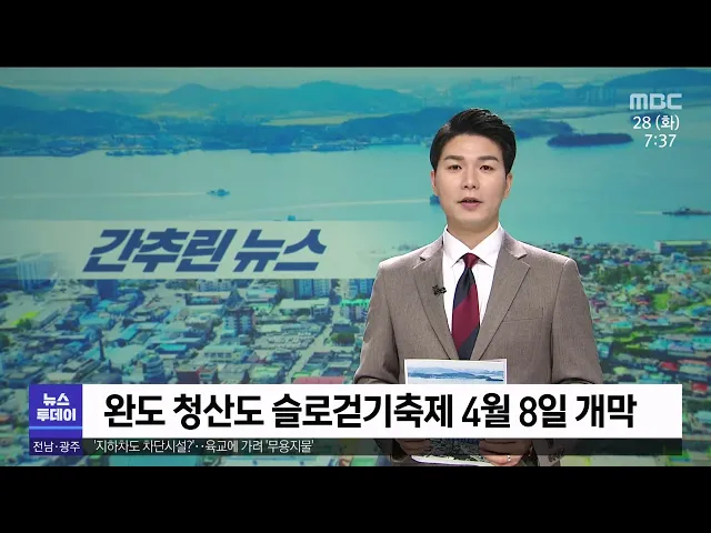 ◀ANC▶ 오늘의 간추린 뉴스입니다. 4월 8일 개막하는 청산도 슬로 걷기 축제를 앞두고 완도군이 준비작업을 서두르고 있습니다. 올해 청산도 슬로걷기 축제는 특히 치유 프로그램이 강화돼 청산완보 스탬프 투어와 플로깅 캠페인, 야간 청산도 탐방행사인 은하수 투어버스 등이 진행됩니다. ---------- 함평군과 지역 축...