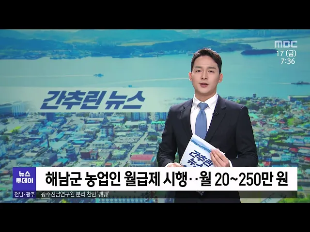◀ANC▶ 오늘의 간추린 뉴스입니다. 해남군은 수확기 대금 가운데 농업인 월급제를 이달부터 시행합니다. 최소 20만원에서 최대 250만원까지 월급처럼 선지급하는 이번 사업에는 관내 8개 지역농협이 참여하고, 해남군은 월급제 시행 8개월간 선지급에 따른 대금 이자를 보전해 줄 예정입니다. ------- 완도군은 어르신들...