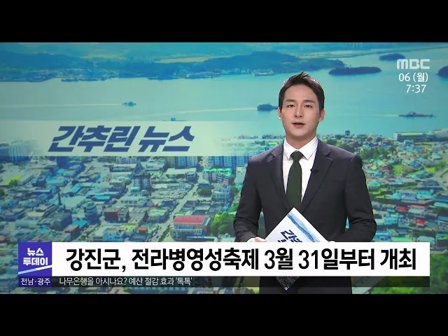◀ANC▶ 오늘의 간추린 뉴스입니다. 강진군은 3월 31일부터 4월 2일까지 병영면 일대에서 26회 전라병영성 축제를 개최합니다. 이번 축제는 금곡사 벚꽃 삼십리길 축제와 연계해 추진될 예정이며, 조선의복 체험과 병영 난장 운영 등 다양한 프로그램이 펼쳐질 예정입니다. ------ 무안군이 음식물폐기물 감량기 지원사업...