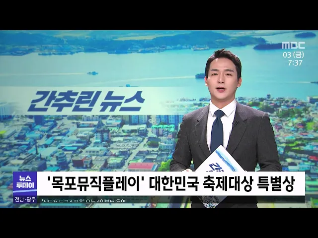 ◀ANC▶ 오늘의 간추린 뉴스입니다. 목포뮤직플레이가 제11회 대한민국 축제 콘텐츠 대상에서 특별상을 수상했습니다. 목포 뮤직플레이는 전국단위 경연대회를 선보이며 호응을 얻었고, 목포 근대문화와의 접목, 김시스터즈 초청공연, 목포음악사 전시관 공개 등이 좋은 평가를 받았습니다. --------- 진도군은 진도개의 ...