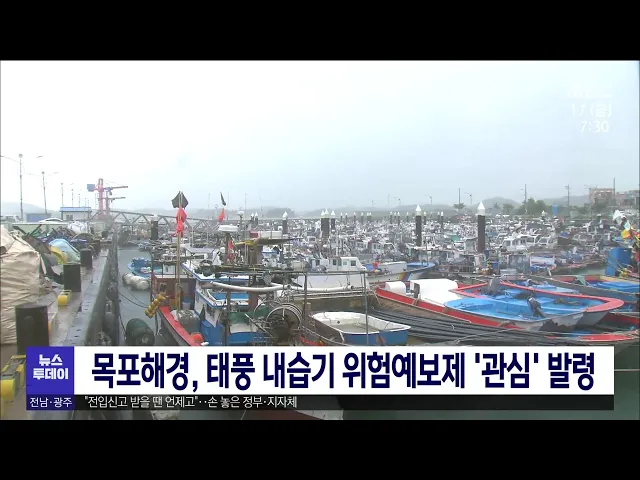 목포해양경찰서는 태풍 내습이 우려되는 오는 10월까지 위험예보제인 '관심'단계를 발령했습니다. 해경은 위험예보기간에 다목적 방송장비 등을 이용해 홍보와 안전계도 활동을 실시하고 각 항포구와 위험지역 순찰 활동을 강화할 계획입니다. 최근 3년 동안 목포 인근에서 발생한 연안안전사고는 모두 1백43건으로 이 가운...