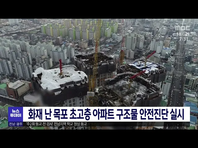 불이 난 목포 초고층 신축아파트 공사현장에 대한 안전진단이 실시됐습니다. 국토부안전진단 전문기관 2곳은 시공사 측으로부터 안전진단 검사를 의뢰받고 지난 16일 새벽 불이난 47층 콘크리트 강도와 거푸집 안정성 등을 점검했습니다. 한편 목포시는 안전진단 검사 결과를 토대로 아파트 건설 시공사에 안전 조치계획 등...