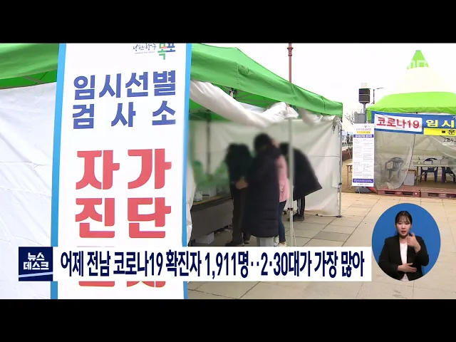 어제 전남지역에서 천9백11명의 코로나19 확진자가 발생했습니다. 지역별로는 목포가 280명, 여수시 270명, 순천시 237명, 무안군 148명, 영암군 56명 등입니다. 연령대 별로는 2,30대가 전체 29%인 554명으로 가장 많았고 0세부터 11세 사이 백신 미접종 군에서도 230명이 발생했습니다. 도내에서 재택 치료 중인 확진자...