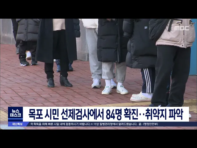 목포시가 지난 13일부터 이틀 동안 시민 선제검사를 실시한 결과 2만 3백75명이 검사에 참여해 84명이 확진된 것으로 나타났습니다. 선제 검사를 분석한 결과 3개 동에서 선원과 유흥업소 등의 집단감염의 영향으로 다수의 확진자가 발생했고, 가족집단 감염과 지인에 의한 추가 전파가 최근 확산세의 원인으로 파악됐습니...