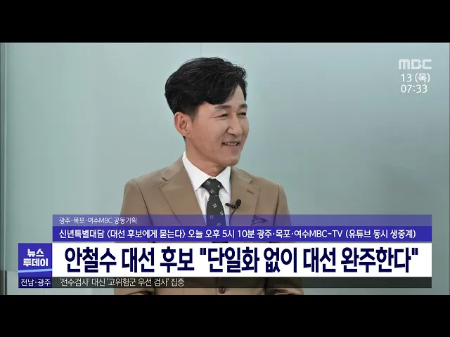 안철수 국민의당 대선후보가 대선 완주의지를 다시금 밝혔습니다. 광주*목포*여수MBC가 공동기획한 신년특별대담에 출연한 안철수 후보는 자신은 당선돼서 대통령이 되려고 나섰고 설을 전후해 3강구도가 형성될 것이라며 정당이나 후보간 단일화에 나서지 않고 대선을 완주할 것이라고 말했습니다. 안철수 후보에게 묻는다...