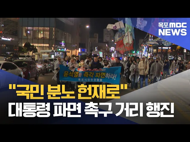 내란 우두머리 피의자 윤석열 대통령의 파면을 촉구하는 시민들이 빗방울이 떨어지는 궂은 날씨에도 대규모 거리 행진에 나섰습니다.목포시민주권행동 주최로 어제(27) 저녁 목포 평화광장에서 열린 이번 집회에는 시민 2백여 명이 참석한 가운데발언과 구호 제창, 거리 행진 등이 이뤄졌습니다.이들은 무너진 경제를 회복...
