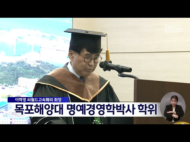 씨월드고속훼리 이혁영 회장이 국립목포해양대학교 2024학년도 전기 학위수여식에서 명예경영학박사 학위를 수여받았습니다.이 회장은 국립목포해양대학교의 기성회 이사장을 역임하면서 대학 주요 사업의 투자계획 등 효율적인 집행에 기여하며 현재까지 목포해양대에 1억원 이상의 발전기금을 기탁했습니다.이혁영 회장은...