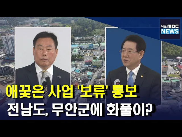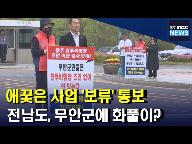 ◀ANC▶ 광주 군공항 특별법 통과 이후 군공항 이전지인 전남이 연일 시끄럽습니다. 광주시장의 연일 계속된 군공항 관련 언급에 전남지사는 반박과 해명 수준에 그치는 등 목소리를 크게 내야할 전남이 오히려 광주시에 이슈 선점을 빼앗겼습니다. 이런 가운데 무안군이 추진하려던 대형프로젝트를 전라남도가 돌연 보류...