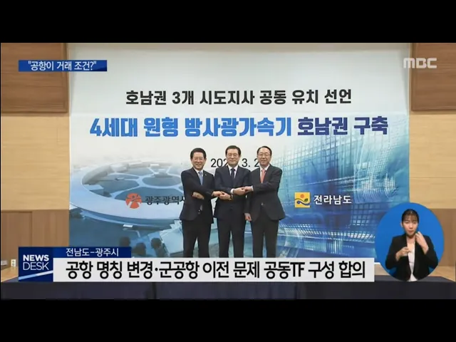 ◀ANC▶ 한동안 잠잠하던 무안공항 명칭 변경과 광주 군공항 이전 논란이 다시 수면 위로 떠올랐습니다. 방사광가속기를 계기로 전라남도와 광주시가 이 문제들을 다시 논의하기로 하면서 무안군은 크게 반발하고 있습니다. 문연철 기자가 취재했습니다. ◀END▶ ◀VCR▶ 광주 민간공항을 내년까지 무안국제공항으로 통...