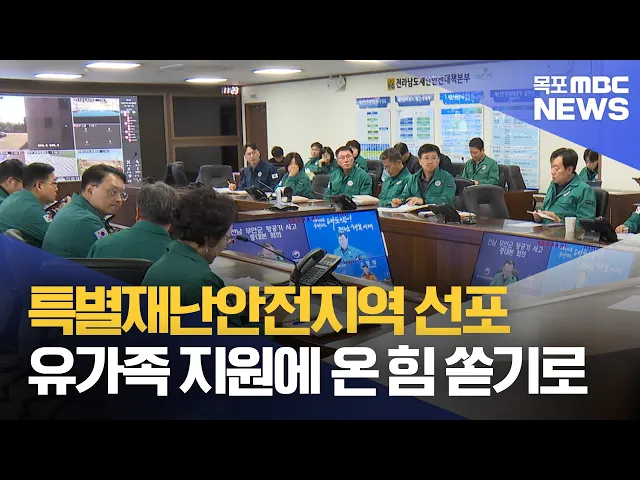 ◀ 앵 커 ▶제주항공 여객기 참사와 관련해 전라남도는 재난안전대책본부를 구성하고 유가족 지원에 나서고 있습니다.정부도 무안지역을 특별재난안전지역으로 선포했습니다.김 윤 기자가 보도합니다.◀ END ▶◀ 리포트 ▶제주항공 여객기 참사가 발생한 뒤 전남도는도민재난상황을 중심으로 즉시 재난안전대책본부를 구성하고 ...
