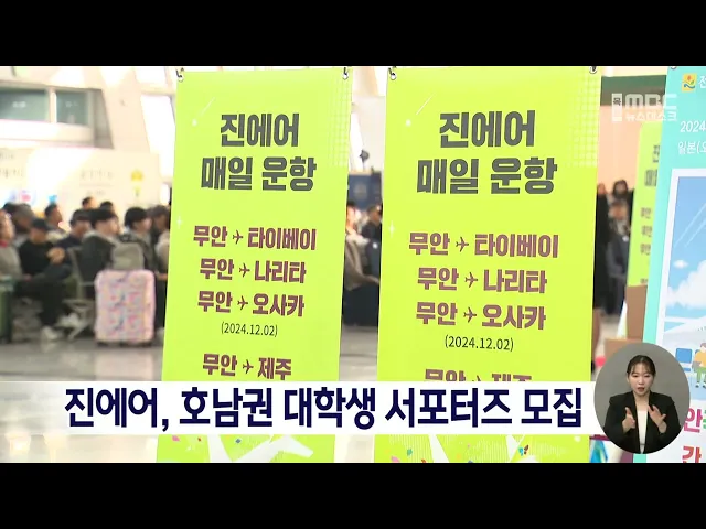 무안국제공항에서 제주와 일본, 대만 노선을 운영중인 진에어가 호남권 소재 대학생을 대상으로 서포터즈를 모집합니다.진에어는 대학생 서포터즈를 통해 지난 2일 취항한 무안발 나리타, 오사카, 타이베이 노선을 적극 홍보하고 무안국제공항의 이용 편리성 등을 알리는데 주력할 계획입니다.
