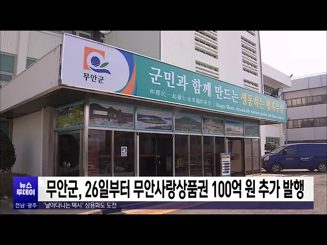 무안군이 연말 위축된 소비심리 회복을 위해100억 원 규모의 무안사랑상품권을 추가 발행합니다.무안군은 오는 26일부터 예비비 100억 원을 투입해 할인율 10%의 상품권을 추가 발행하고, 구매 한도도 월 50만 원에서 70만 원으로 상향합니다.