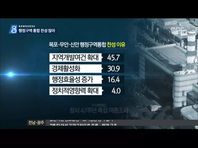 ◀ANC▶ 서남권의 해묵은, 그러나 가장 민감한 문제인 무안반도 통합 문제에 대해서는 찬성 의견이 높았습니다. 그동안의 통합실패 원인으로는 주민간·지역간 공감대 부족이 꼽혔습니다. 문연철 기자 입니다. ◀VCR▶ CG22- 목포시와 무안군·신안군의 행정구역 통합에 대해 70.9%가 찬성 한다고 답했습니다./ CG23- 지역...
