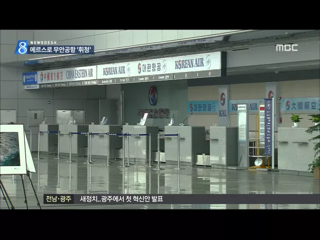 ◀ANC▶ 메르스 여파가 개항 8년 만에 기지개를 켜는 무안공항에 찬 물을 끼얹고 있습니다. 이용객 수는 반토막 났고 국제노선은 줄줄이 취소되고 있습니다. 문연철기자가 보도합니다. ◀END▶ ◀VCR▶ 여름 성수기를 앞둔 한 여행사 사무실, 여행을 문의하는 전화나 손님들이 거의 끊긴 채 개점 휴업 상탭니다. ◀INT...