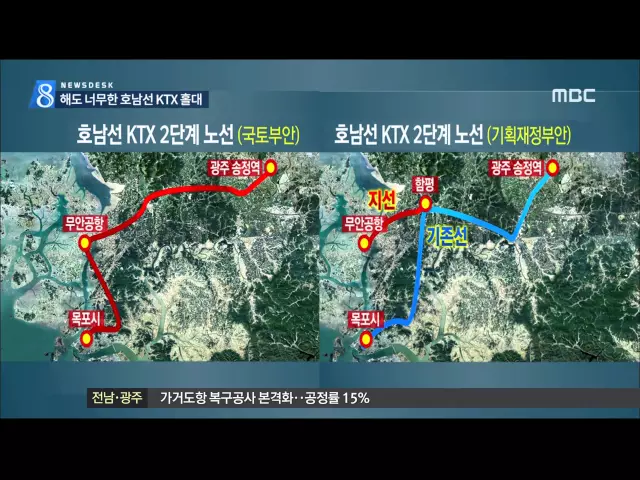 ◀ANC▶ 오랜 지역 숙원인 호남선 KTX 2단계 사업이 노선 문제로 표류하고 있습니다. 중앙부처끼리 노선에 대한 입장이 크게 엇갈려 해답을 찾기가 여의치 않습니다. 문연철기자가 보도합니다. ◀END▶ ◀VCR▶ (C/G) 나주와 무안공항을 동시 경유하는 국토부,전라남도의 노선안을 기획재정부는 경제성이 없다고 일축합...