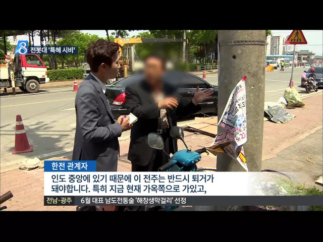 국회의원 사무실 인근 전봇대가 철거된 배경을 놓고 특혜 의혹이 일고 있습니다. 한국전력은 지난 2월, 새정치연합 이윤석 의원의 무안군 사무소 인근에 있던 고압과 저압 전봇대 두 기를 철거했는데, 무안지역 사회단체는 "유독 이 의원 민원만 해결한 것은 특혜"라며 반발하고 있습니다. 한전은 "위험한 노후 전봇대를 민...