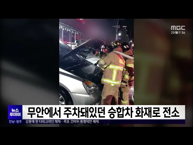 어제(24) 오후 9시 50분쯤 무안군 무안읍의 한 공터에 주차돼있던승합차에서 불이나 10여분 만에 꺼졌지만 모두 탔습니다.다행히 인명피해는 없었으며소방당국은 시동을 거는 중 엔진 룸에서 연기가 발생했다는 운전자 진술을 토대로 정확한 화재 원인을 조사하고 있습니다.