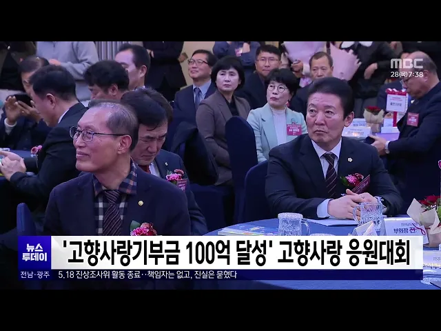 전남지역 고향사랑기부금100억 원 달성과 서포터즈 43만 명 돌파를 기념하는 '전남 한마음 고향사랑 응원대회'가 어제 목포 신안비치호텔에서 열렸습니다. 이 자리에서는 전남도와 도의회, 22개 시군, 향우회 등 40여 기관이 참여해 국립의대 설립과 무안국제공항 활성화 등 전남 현안 과제 해결에 공동 대응하고 고향사...