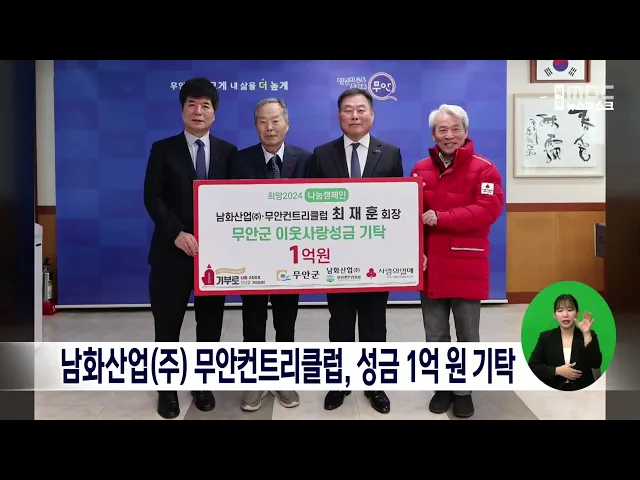 무안군 청계면에 소재한남화산업 무안컨트리클럽 최재훈 회장이이웃사랑성금 1억 원을 기탁했습니다. 무안컨트리클럽은 4년 째 해마다1억 원을 기부하는 등 사회공헌 활동을지속하고 있으며, 지난해 기탁한 성금으로는무안지역자활센터에 차량을 지원했습니다.