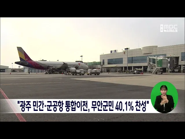 전남연구원이한국갤럽에 의뢰해 여론조사를 실시한 결과전남도민 56.1%, 무안군민 40.1%가광주 민간·군공항의 무안국제공항 통합 이전에 찬성하는 것으로 나타났습니다.찬성 이유로는일자리, 인구증가로 지역활성화 기대,지원사업을 통한 지역발전 등이 꼽혔고한국갤럽이 앞서 실시한 4차례의여론조사보다 찬성률이 높았습...