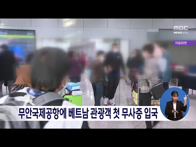 무안국제공항으로 입국하는 베트남과 필리핀, 인도네시아 등 3개국의 무사증 제도가 시행된 가운데 첫 해외관광객들이 입국했습니다. 이번 나트랑-무안국제공항 전세기로 입국한 50여 명은 보성 녹차밭과 영암 왕인박사 유적지 등 전남의 주요관광지를 둘러볼 예정이며 연말까지 베트남 관광객 만여 명이 전남을 찾을 예정...