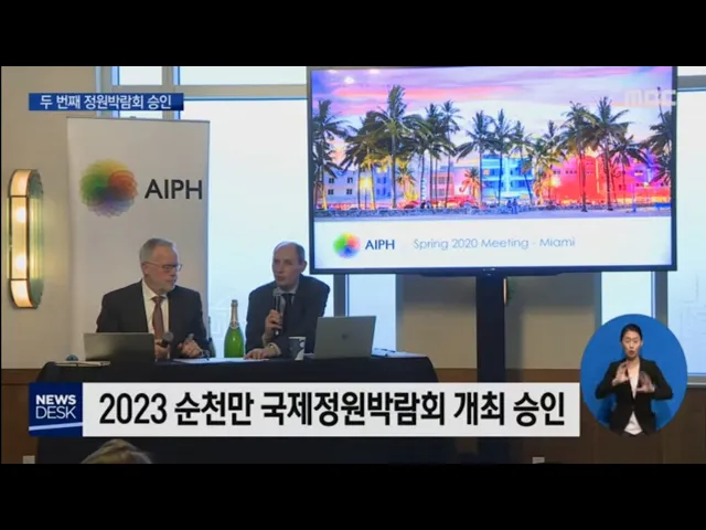 ◀ANC▶ 순천만에서 또 한 차례 국제정원박람회가 열리게 됐습니다. 국제원예생산자협회 총회에서 2023년 개최를 승인했는데요, 기재부 심의를 통과하면 지난 2013년에 이어 10년 만에 박람회를 열게 됩니다. 박민주기자가 취재했습니다. ◀END▶ 미국 플로리다주 마이애미에서 열린 국제원예생산자협회 AIPH 총회, 이 자...