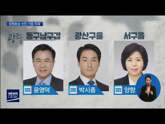 (앵커) 4.15 총선을 40일 가량 앞두고 더불어민주당 경선이 막바지로 향하고있습니다. 광주지역 경선에서는 정치 신인들이 구청장 출신 후보들을 격파하고 본선행 티켓을 거머줬습니다. 권리당원들의 표심과 신인 가산점이 승패를 가른 것으로 보입니다. 이계상 기자.. (기자) 민주당 경선 막판까지 치열한 경쟁이 펼쳐졌던...
