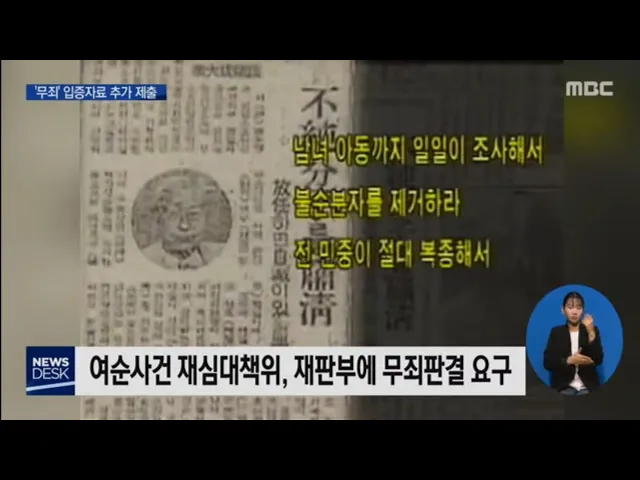 ◀ANC▶ 여순사건 당시 군법회의에서 처형당한 고 장환봉 씨에 대한 재심, 이제 선고 전 마지막 공판만 남겨두고 있습니다. 어제(17) 시민단체가 무죄를 입증하기 위한 주요 자료들을 찾아내 재판부에 추가로 전달했는데, 판결에 영향을 미칠지가 주목됩니다. 조희원 기자입니다. ◀VCR▶ 지난 1999년, MBC가 보도한 여순...