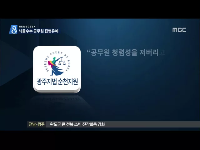 ◀ANC▶ 중흥건설 비자금 사건에 대한 검찰 수사가 마무리된 지 2개월만에 관련자에 대한 첫 판결이 나왔습니다. 중흥 측으로부터 뇌물을 받은 전 광양경제청 공무원이 집행유예를 선고받았습니다. 보도에 문형철 기자입니다. ◀VCR▶ 중흥건설로부터 뇌물을 받은 혐의로 기소된 전 광양만권경제자유구역청 공무원 63살 ...
