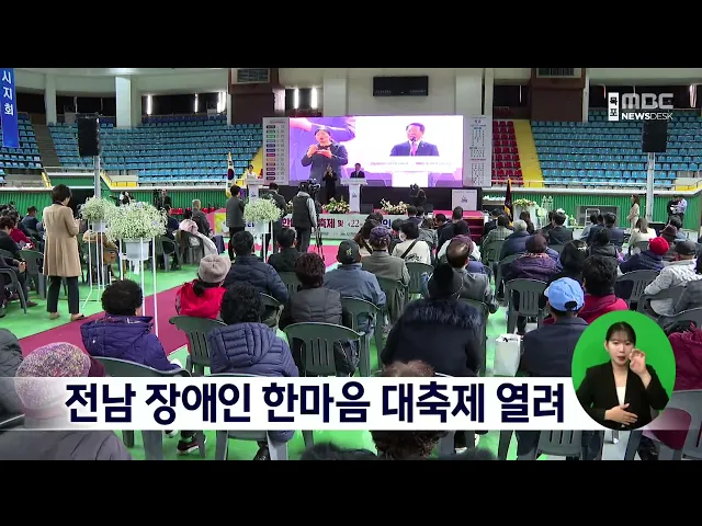 전남 장애인 한마음 대축제와 '장애인 동거부부 합동결혼식'가순천 팔마체육관에서 열렸습니다.전라남도는 장애인들의 화합의 자리를 마련하고, 여러 사정으로 미뤄졌던 장애인 부부들의 결혼식도 지원했습니다. 김영록 지사는 '장애인 일자리를 확대하고 콜택시 확대 등 장애인 이동권 보장에 힘쓰겠다'고 밝혔습니다.