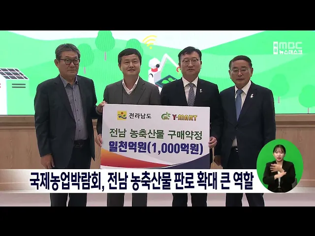 순천에서 개최되고 있는 국제농업박람회가 전남 농축산물의 판로 확대에 도움이 되고있습니다.재단법인 전라남도국제농업박람회는 와이마트와 천억여원 상당의 전남 농축수산물 구매 약정을 체결한데 이어 창대FB 등과도 2천300만 달러의 수출 약정을체결했습니다.이에 앞서 농협경제지주 등 6개사와도 2천억 원 상당의 ...