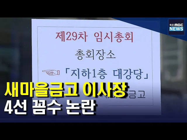 ◀ 앵 커 ▶순천의 한 새마을금고 이사장이3선을 지낸 뒤 중도 사퇴하고고령의 90대 새 이사장이 선출됐었는데요최근 이 90대 이사장이6개월 만에 건강상의 이유를 들어 그만뒀고보궐선거를 통해 전 이사장이단독 출마해 결국 4선 이사장이 됐습니다.당시 3선 초과 제한을 피하고자편법을 쓴 것 아니냐는 의혹이 나왔는데 현...