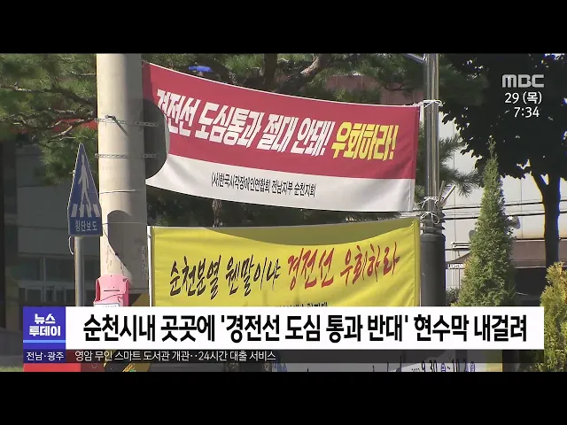 (앵커) 요즘 순천 시내에는 거리마다 경전선 도심통과 반대 현수막이 즐비합니다. 순천시의회가 이같은 시민 정서를 반영해 특위를 구성하고, 공식적인 반대 운동을 시작해 벌써부터 특위 활동 결과가 주목을 받고 있습니다. 최우식 기자가 보도합니다. (기자) 순천시청 인근 도로변에 경전선 도심 통과를 반대한다는 내용...