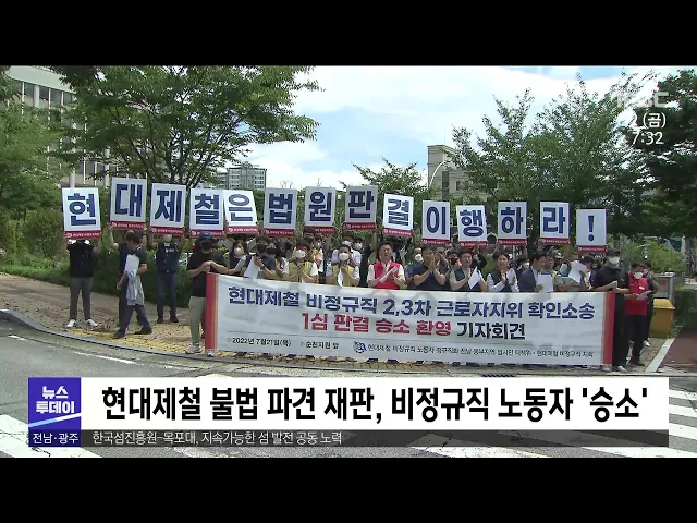 ◀ANC▶ 현대제철 순천공장 불법 파견 소송에서 법원이 비정규직 노동자들의 손을 들어줬습니다. 6년 2개월 만에 내려진 승소 판결에 대해 노동자들은 크게 환영하며 현대제철의 직접고용을 촉구했습니다. 문형철 기자입니다. ◀VCR▶ 현대제철 불법 파견에 대한 1심 재판에서 법원이 노동자들의 손을 들어줬습니다. 광주...