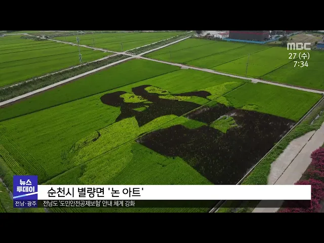 ◀ANC▶ 전남 순천의 한 농촌 들녁에 내년도 국제정원박람회 성공을 기원하는 한 폭의 멋진 그림이 그려지고 있습니다. 추수가 가까워질수록 더욱 선명하게 채색될 일명 '논 아트'인데, 올해로 5년째 이어져오면서 지역의 새로운 명물로 자리잡고 있습니다. 최우식 기자가 취재했습니다. ◀VCR▶ (전남) 순천시 별량면 봉...
