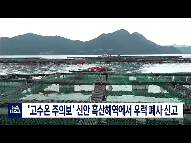 폭염 속에 고수온 주의보가 내려진 신안 흑산해역에서 올해 첫 어패류 피해 신고가 접수됐습니다. 전라남도는 오늘(7) 신안군 흑산면의 한 우럭 양식장에서 우럭 190여 마리가 폐사했다는 신고가 접수됐으며, 고수온 영향인지 확인하기 위해 합동 피해조사를 실시하겠다고 밝혔습니다. 현재 전남 함평만과 도암만, 득량만,...