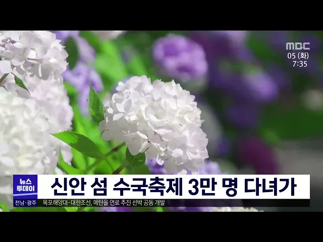 지난달 24일부터 열흘동안 열린 신안군 섬 수국축제에 3만여 명이 다녀간 것으로 집계됐습니다. 신안군은 축제 이후에도 수국꽃이 남아있는 7월 말까지 수국공원 방문이 가능하며, 9월에는 목수국과 팜파스그라스 감상이 가능하다고 설명했습니다.