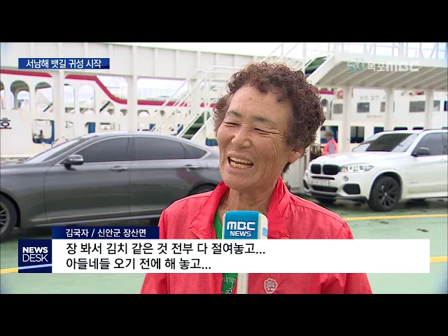◀ANC▶ 닷새 동안의 추석 연휴가 본격적으로 시작됐습니다. 서남해 섬 고향으로 향하는 뱃길 귀성은 오늘부터 본격화될 전망인데요. 그만큼 배편도 크게 늘었습니다. 김진선 기자입니다. ◀END▶ ◀VCR▶ 아직 다리가 놓이지 않은 신안 장산도로 향하는 차도선. 천안에서 목포까지 차량으로 3시간을 달려온 가족 귀성...
