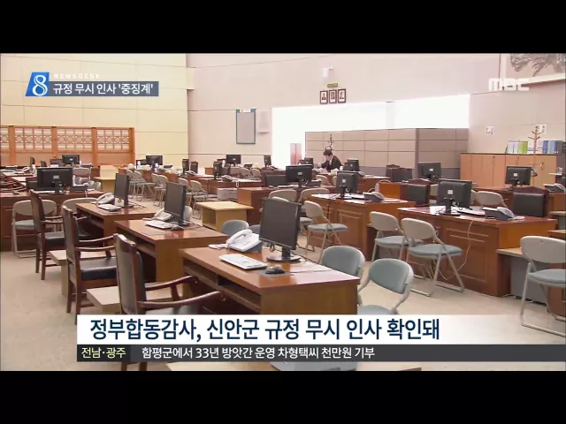 ◀ANC▶ 지난해 10월, '신안군의 인사가 규정을 무시했다'는 MBC의 보도 직후 정부가 실시했던 합동감사 결과가 나왔습니다. 실제 인사를 맡았던 공무원에 대해 중징계 처분을 요구했습니다. 양현승 기자가 취재했습니다. ◀END▶ ◀VCR▶ 지난해 10월 이뤄진 신안군의 하반기 정기인사. 4명의 6급 공무원들이 보직을 받...
