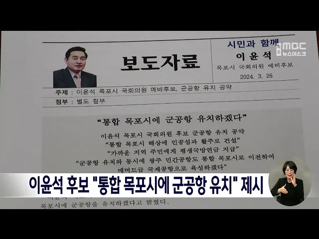 제 22대 국회의원 선거 목포시 지역구에 출마하는 무소속 이윤석 후보는 오늘(26일) 기자회견을 갖고 통합 목포시에 군공항을 유치하겠다고 밝혔습니다. 이 후보는 "목포·신안·무안 통합 추진과 함께 통합 목포시 해상에 광주 군공항을 유치하겠다"며 "광주 민간공항도 군공항 유치와 동시에 통합 목포시로 이전을 추진해 ...